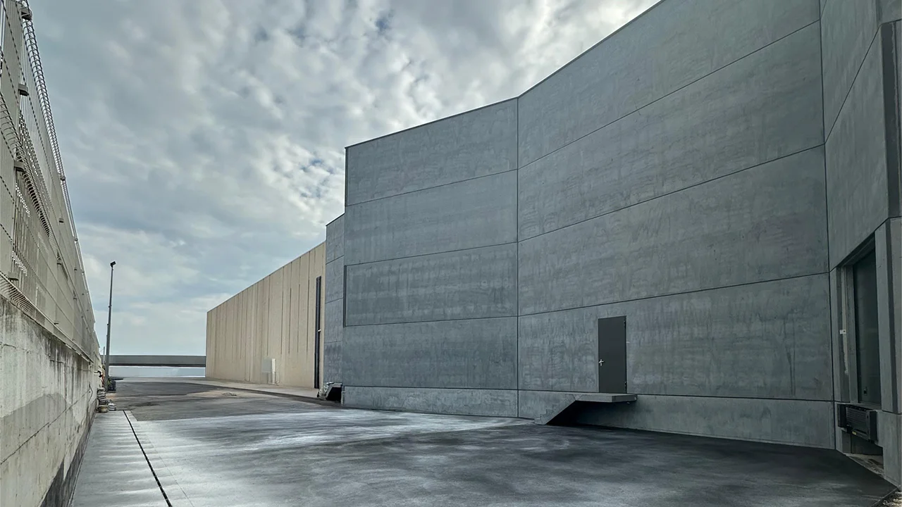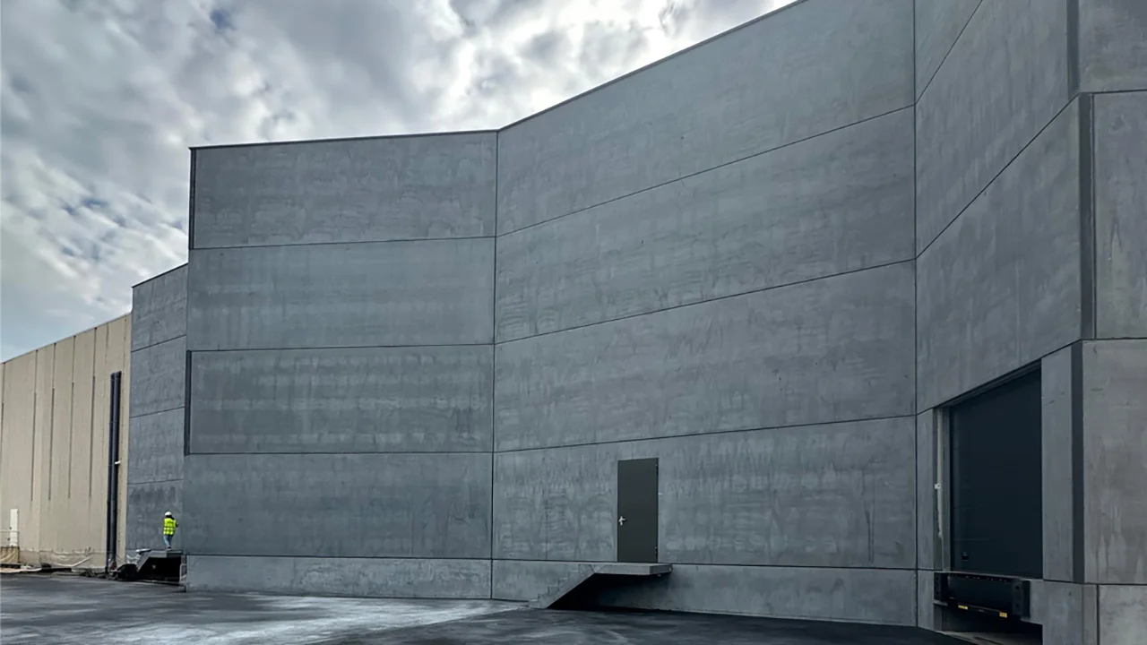 Supply of prefabricated reinforced concrete structure, including pigmented façade panels and prestressed concrete beams.
